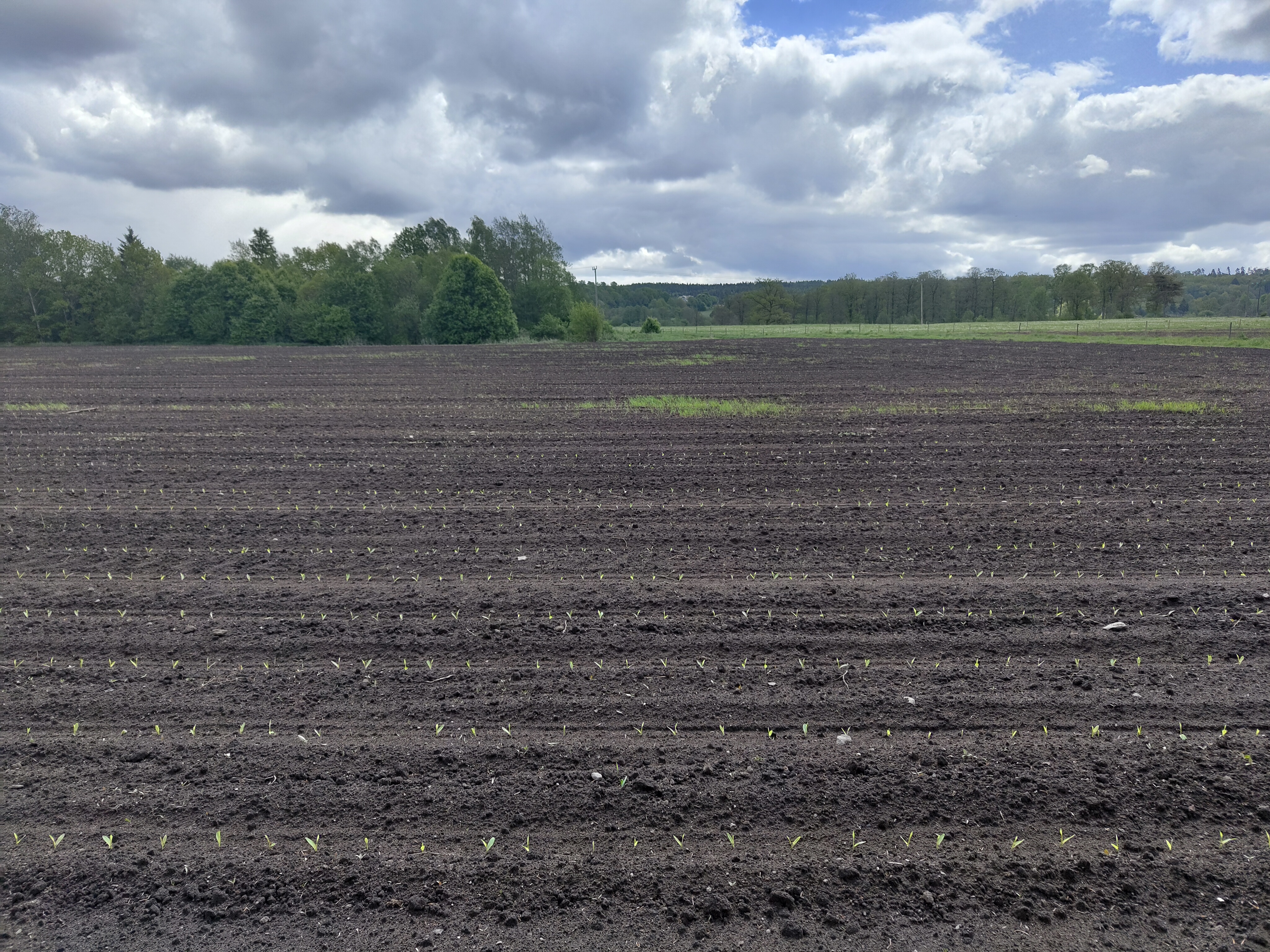 Efter de senaste regnskurarna har majsen nu börjat etablera sig tydligt i fältet. Sådden genomfördes den 12 maj, och plantorna har nu nått en höjd på cirka 2 cm vid stam- eller skottbasen.